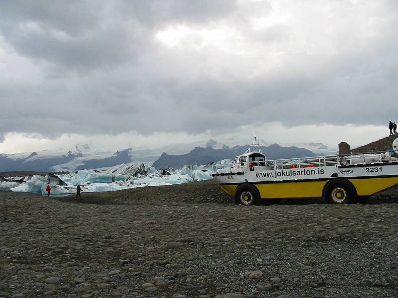 Mit diesen etwas merkwürdig aussehenden Fahrzeugen kann man eine Fahrt auf der Lagune zwischen den Eisbergen machen.